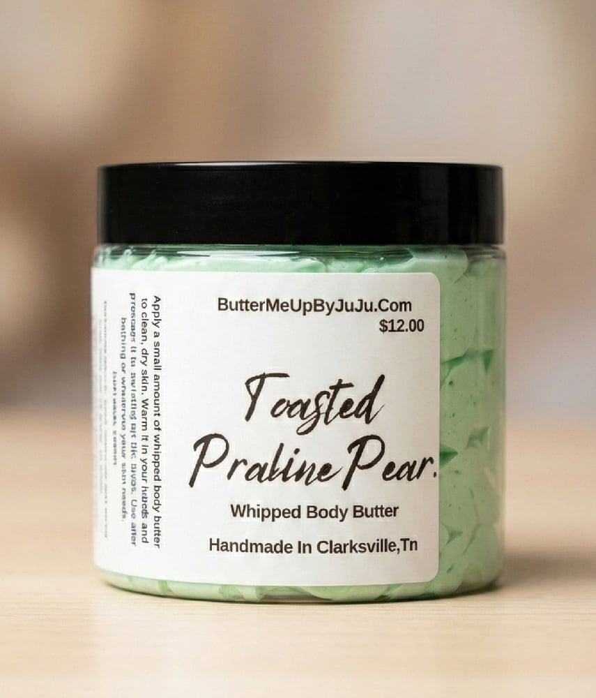 "✨ Treat your skin to a little slice of heaven! Our Toasted Praline Pear Body Butter is whipped to fluffy perfection and smells good enough to eat. With notes of warm, caramelized nuts and crisp, juicy pear, it’s the ultimate guilt-free dessert for your skin. Get ready to glow! 🍐💕"